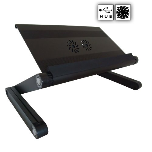 Support ordinateur portable spécial canapé et lit Zenlap Lapmate Ace noir . Le support ordinateur portable Zenlap Lapmate Ace noir vous permet de travailler ou de vous divertir devant votre ordinateur confortablement sur votre canapé ou dans votre lit. Léger et confortable grâce à son repose-poignets en caoutchouc, il est réglable en hauteur et inclinaison sur simple pression des boutons charnières pour offrir une ergonomie optimale en position assise et couchée. Il intègre 2 ventilateurs USB de haute performance qui maintiennent votre portable à sa température idéale, et un hub USB 2.0 de 4 ports, tous deux situés dans le même bloc au dessous de la tablette. Sa taille est adaptée aux ordinateurs portables jusqu'à 17 pouces. Garantie 5 ans. Avantages · Réglage précis pour que votre position soit parfaite devant l'ordinateur · Lécran est à la hauteur de vos yeux · Le clavier est ajusté à la bonne hauteur et inclinaison · Vous ne sentez pas la chaleur, ni le poids de votre portable · Ventilateurs USB haute performance intégrés pour un refroidissement efficace du portable · Hub USB 2.0 à 4 ports intégré en dessous de la tablette· Repose-poignets en caoutchouc · Peut également servir de table d'appoint · Se range facilement une fois replié · Un alliage daluminium de qualité et léger qui ne conduit pas la chaleur. Composition · Plateau et bras : alliage d'aluminium · Charnières : alliage plastique polymère · Repose-poignets : caoutchouc. Adapté aux portables jusqu'à : 17 pouces. Taille du plateau : 450 * 240 mm. Dimensions du produit replié : 560 * 295 * 42 mm. Hauteur réglable minimum et maximum du plateau : 30 - 540 mm. Espacement des bras : 465 mm. Poids : 2,2 Kg. Charge maximale : 15 Kg.